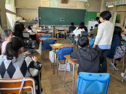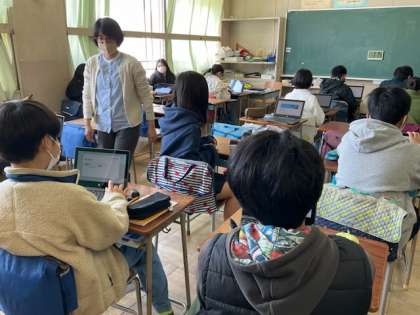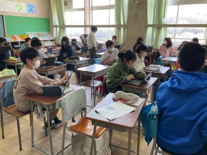 2校時、3年間使用してきたタブレットの返却準備をしています。