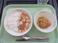 今日のウィンナーピラフのようなまぜごはんは、給食では
