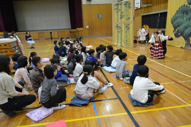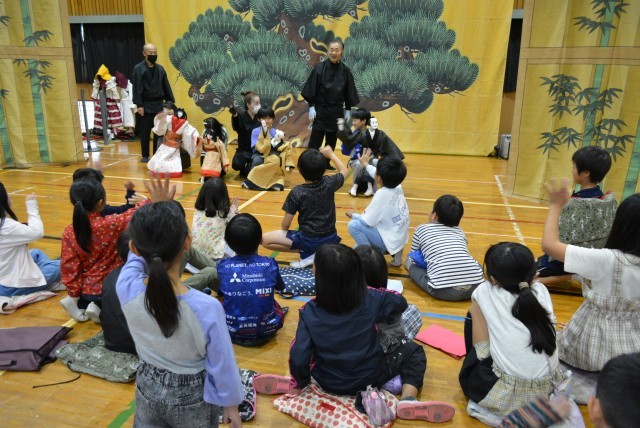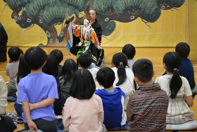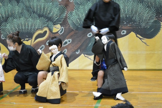 はじめに「三番叟」の鑑賞をして、次に代表児童数名が人形操作を体験しました。