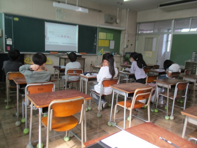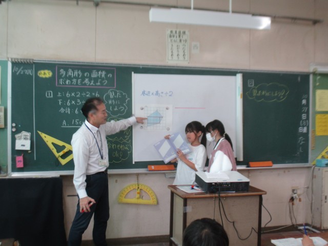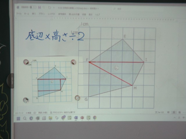 算数は少人数クラスでの学習です。多角形の面積の求め方について、学習したことを活かして考えます。