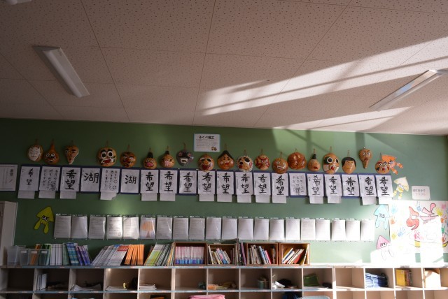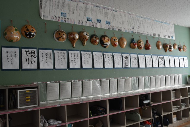 後方には日光移動教室で挑戦した「ふくべ細工」が飾られています。