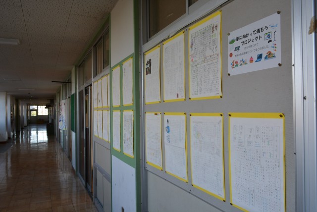 廊下の壁には「夢に向かって進もうプロジェクト」、興味のある職業について調べてまとめたものが掲示されています。
