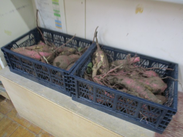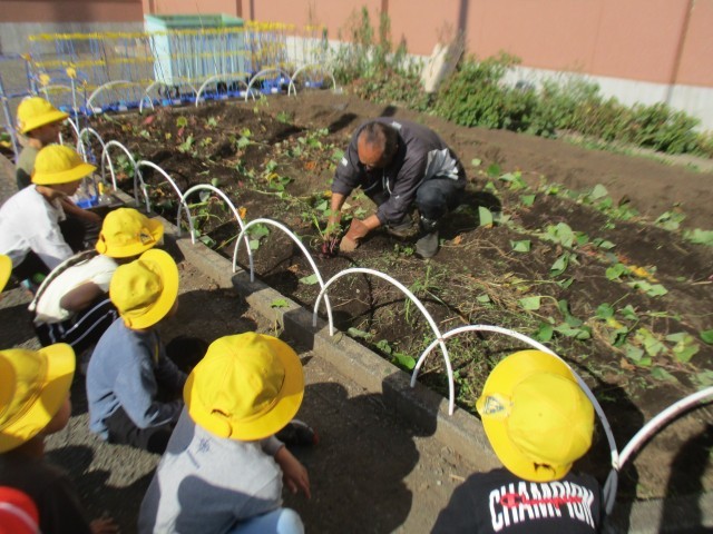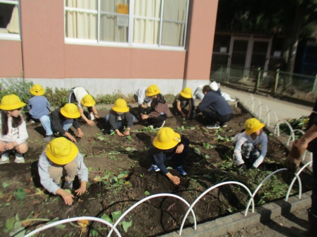 地域の方に掘り方を教わったあと掘りました。「大きいよ!」と、途中、土の中から出てきた幼虫に大騒ぎになり、サツマイモはそっちのけで興味津々。最後は、巨大なサツマイモや長芋やゴボウのような形のサツマイモがたくさん収穫でき、大満足でした。