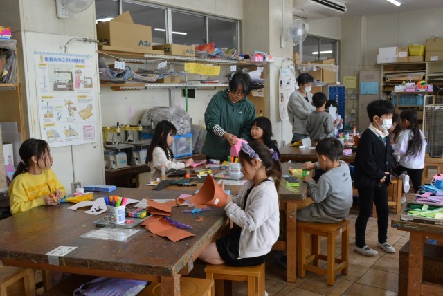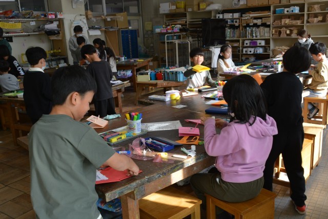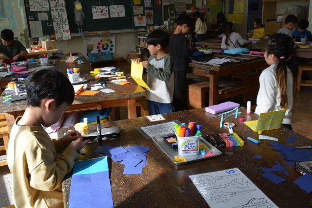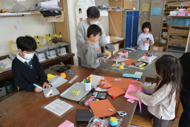 マジックで色を塗ったり、スズランテープで部品を作ったり、工夫してパクパクさんを作っています。