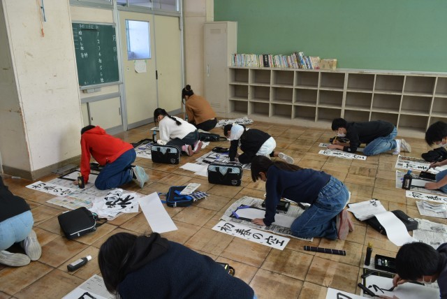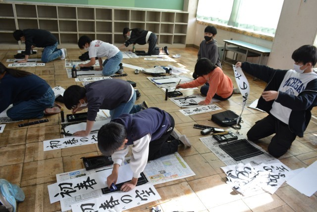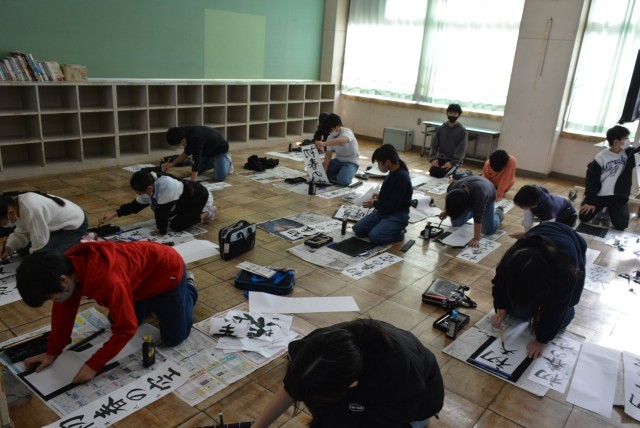 3時間目に半紙で一文字ずつ練習して、4時間目は書き初め用紙に本番を書いています。