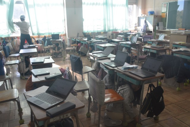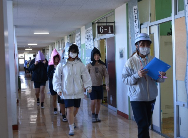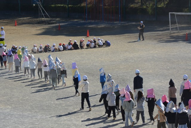 震度4強以上の地震が発生したと想定し、校庭に避難します。