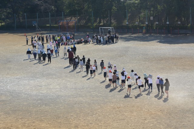 校庭に出ていた児童は校庭の奥に向かい、校舎内にいた児童は教員と校庭に出てきました。