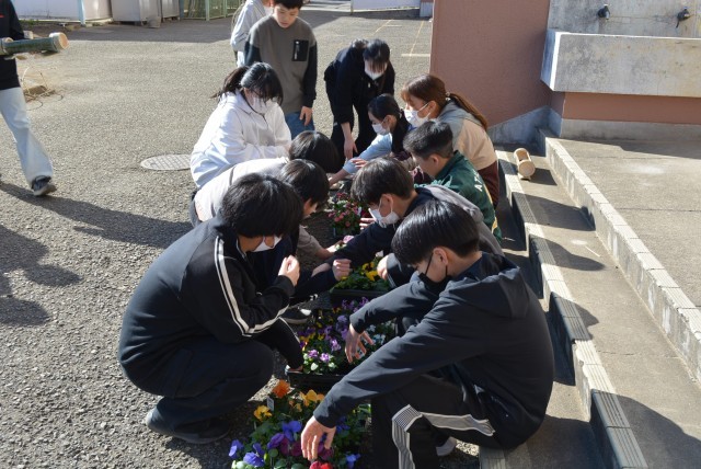 出来上がったプランターが並び、一足早く春が来たように感じます。