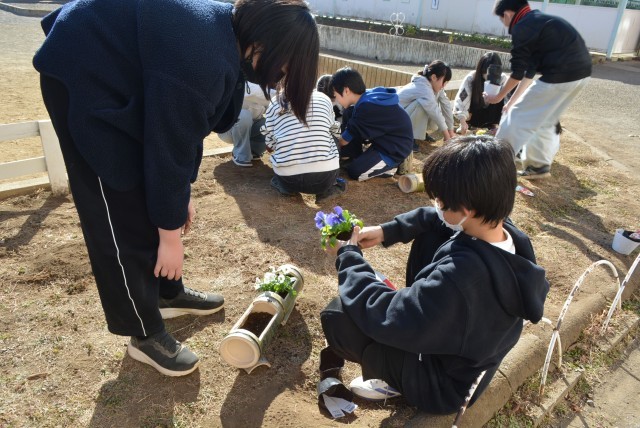 6年生 竹プランター 苗植え