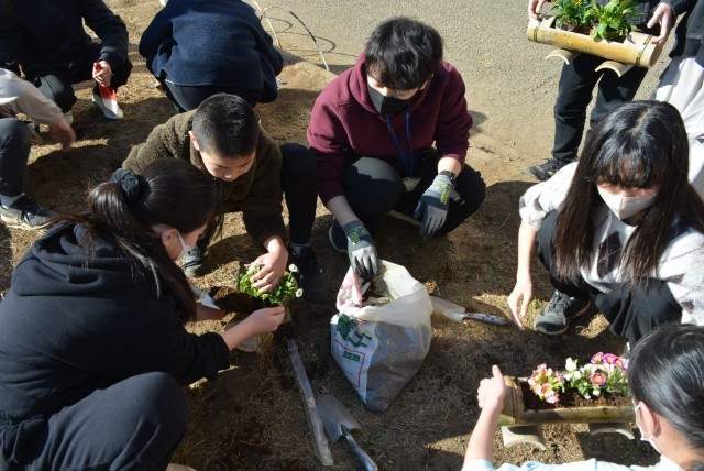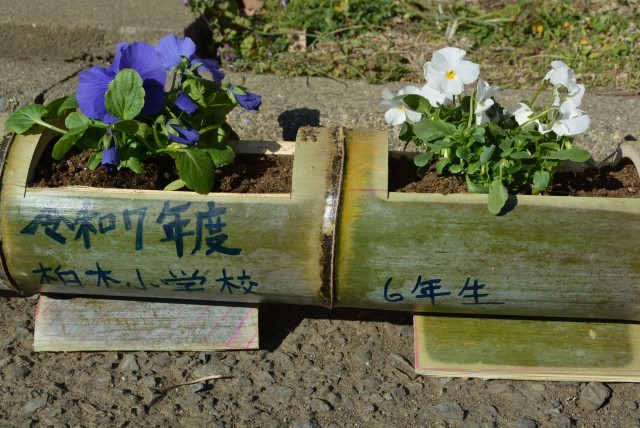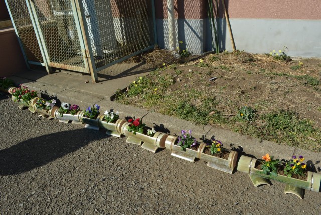 12月・1月と作ってきた竹プランターに、いよいよお花の苗を植えました。