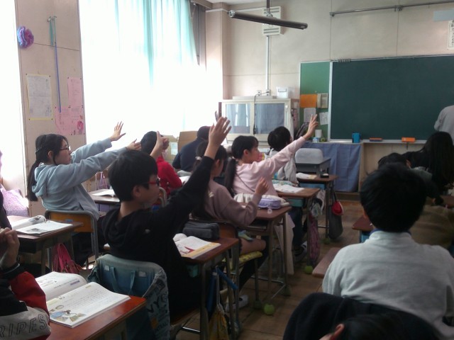 互いを認め合うことについて考えました。たくさんの手が挙がり、「同じ」「違う」と、いろいろな立場の考えが出ていました。