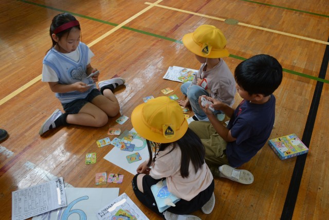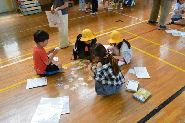 全ての教室をまわりシールを貼り終えたら、体育館に戻ってクイズやかるた・駒などで遊びました。