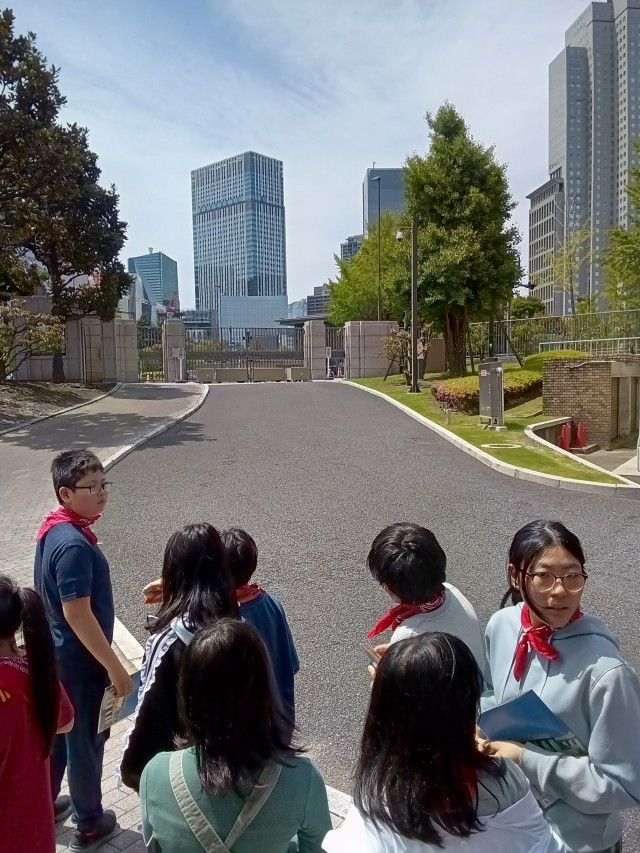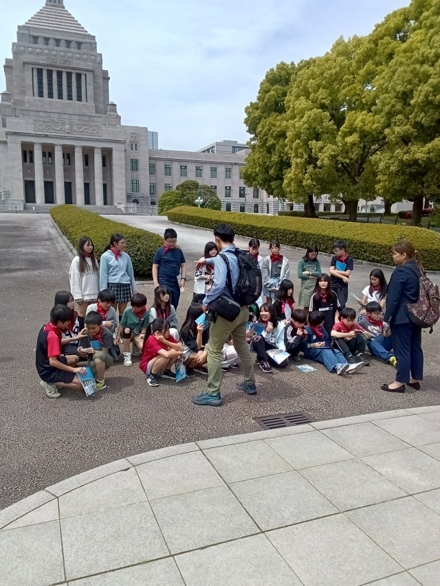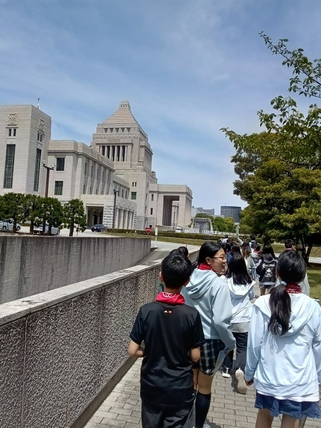 本会議場から外に出て、国会議事堂の正面で記念撮影です。