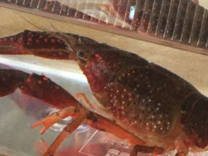 これからザリガニとあそびます。興味津々です。