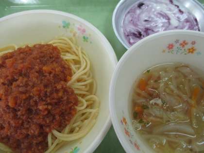 八王子市内で収穫されたブルーベリーをヨーグルトのソースにしました。今年のブルーベリーは、粒が大きくとても甘いのでおいしいソースができました。残さず食べてくれるとうれしいです。