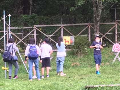 弓矢体験です。獲物に当たらないとご飯にありつけません。