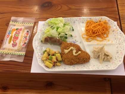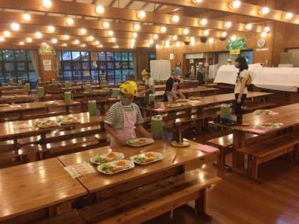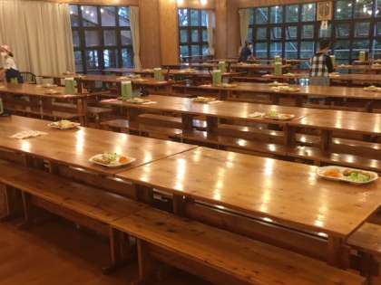 夕食のセットが始まりました。ソーシャルディスタンスをとって食べられるように席が決まっています。