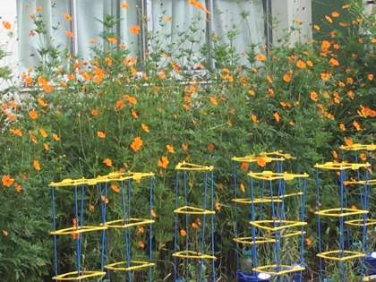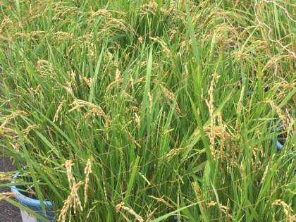 5年生の植えた稲の様子です。キバナコスモスもきれいです。