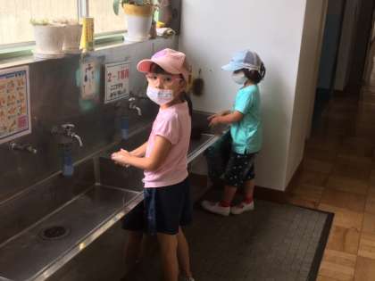 「石鹸で手を洗おう」の曲が流れている間に手を洗います。