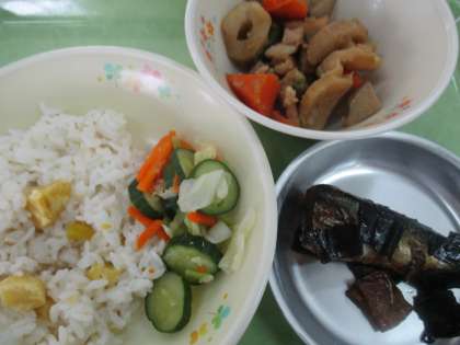 今日は、秋の味覚「くり」、「さんま」、「さといも」を使ったこんだてです。どれもおいしくできたので残さず食べてくださいね。