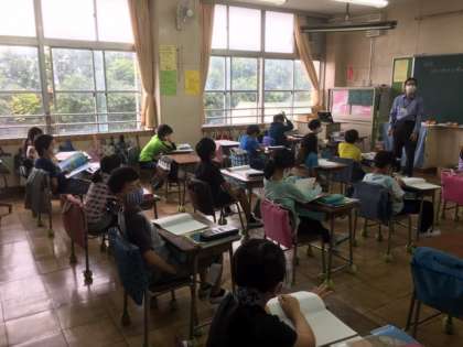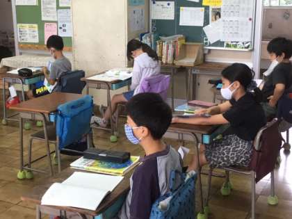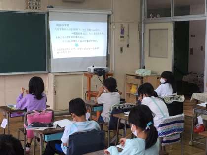 社会科です。フラッシュクイズで、前の時間までのふりかえりをしてから、きょうの学習に入ります。