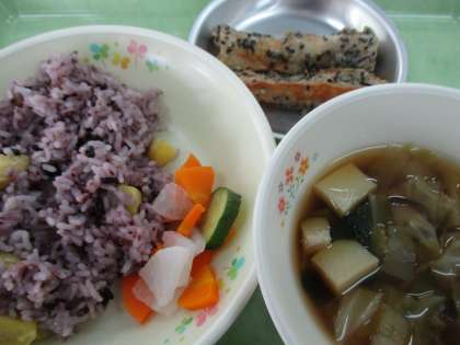 今日から3日間の給食は、高尾山が日本遺産に認定されたことにちなみ、八王子の3つのストーリーにあわせたこんだてです。