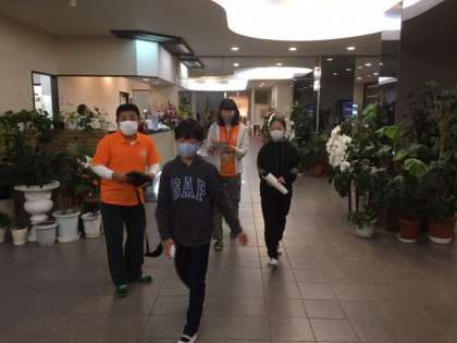 雨天日程での実施とする決定をしました。朝会を放送で行い、司会と挨拶の担当児童がロビーの放送機器で、役割を終え、部屋に戻るところです。