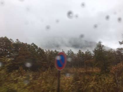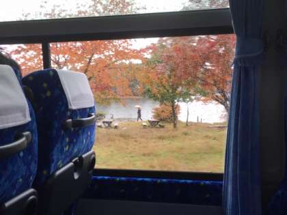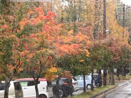 昨日、くっきり見えた男体山が雲の中です。紅葉は、ホテル近くの紅葉。