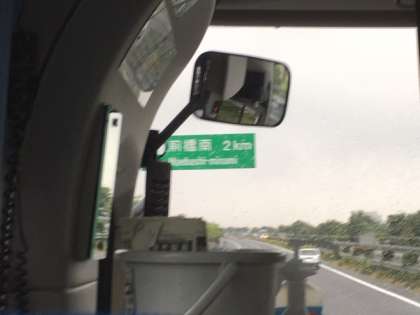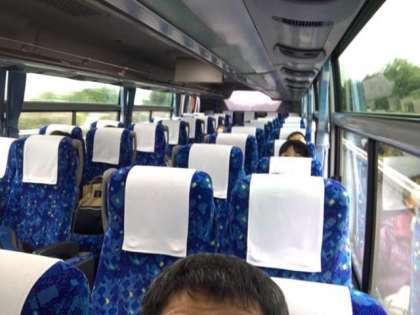 バスの中の様子。ビデオを流していますが、寝ている子も多いです。バスは、前橋南インターまで来ました。