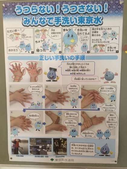 手の洗い方です。学校では、音楽をかけて手洗いをしっかりできるように指導しています。