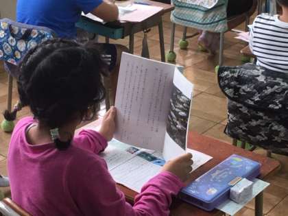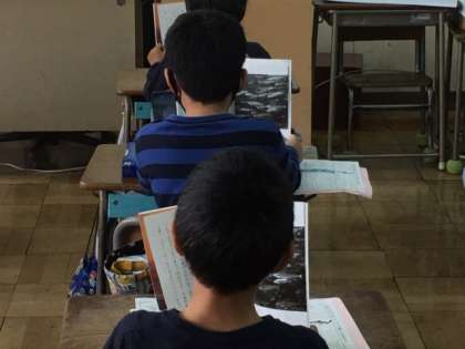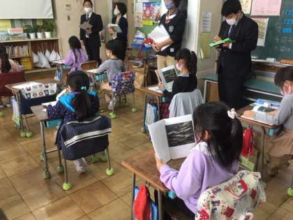 国語です。「さけが大きくなるまで」という説明文の学習です。音読ご始まりました。