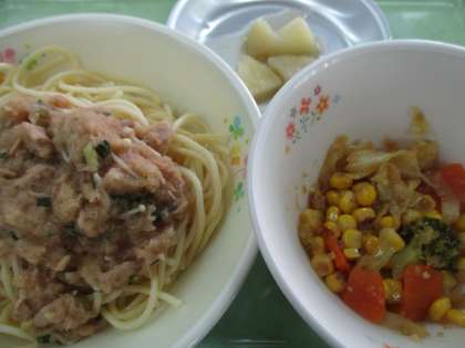 11月5日の給食 公開日 2020/11/05 更新日 2020/11/05 給食室より 5日のこんだては、 ・はち大根おろしスパゲティ ・温野菜のごまドレッシング ・りんごのバター煮 ・牛乳 です。 今日予定されていた「焼きりんご」は、都合により「りんごのバター煮」へ変更となりました。 今日は、八王子産の大根を使った、大根おろしのスパゲティです。スパゲティに、ツナとえのき茸の入ったおろしソースをかけて食べましょう! いいね(0)