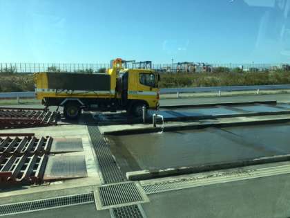 羽田空港からのパリ行きの飛行機も見んことができました。トラックがタイヤを洗います。