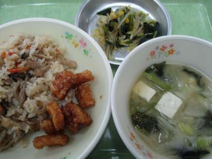11月16日の給食 公開日 2020/11/18 更新日 2020/11/18 給食室より 16日のこんだては、 ・きのこごはん ・いかのカリント揚げ ・みそ汁 ・野菜のおかか和え ・牛乳 です。 今日は秋の味覚の代表「きのこ」をたくさん使った「きのこごはん」です。「しめじ」、「舞茸」、「しいたけ」を使っています。 いいね(0)