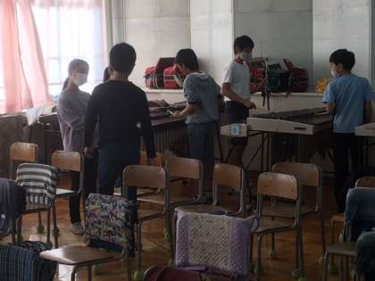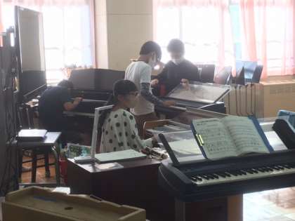 音楽です。パートに分かれて練習していました。