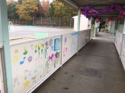 体育館までの長廊下と入口の様子です。