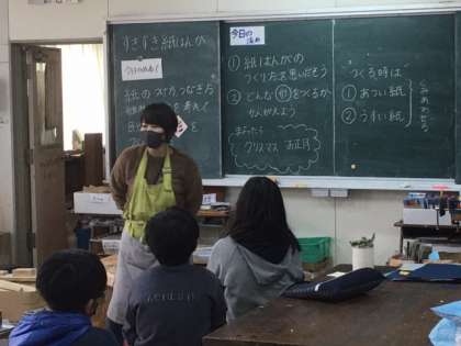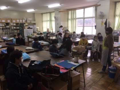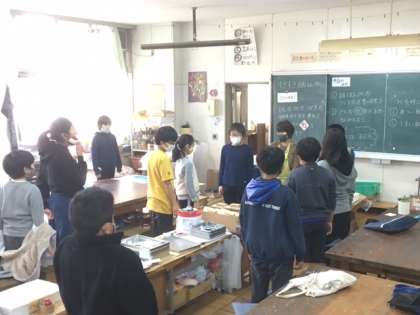 図工です。あいさつです。その後、展覧会のまとめのお話がありました。
