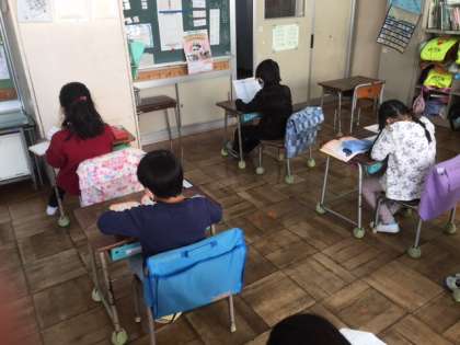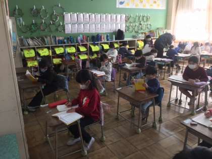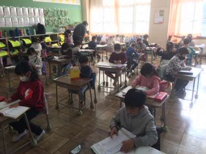 算数です。算数検定を受けました。終わった子は漢字に取り組んでいます。