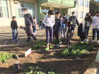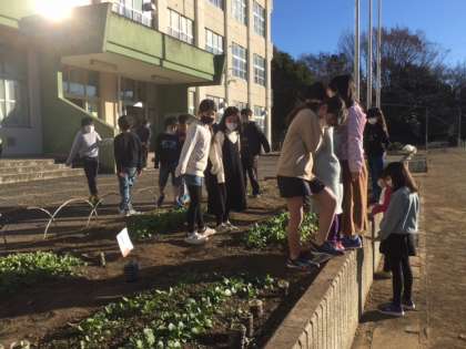 音楽朝会の後に学年園に寄って赤かぶ、白かぶの様子を確かめました。