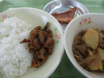 1日のこんだては、 ・ごはん ・赤魚の香味焼き ・肉じゃが ・れんこんのきんぴら ・牛乳 です。