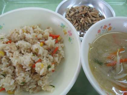 11日のこんだては、 ・チャーハン ・中華みそスープ ・ごまめナッツ ・牛乳 です。