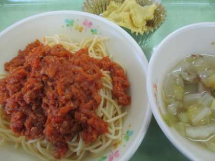 22日のこんだては、 ・スパゲティミートソース ・白菜スープ ・スイートポテト ・牛乳 です。