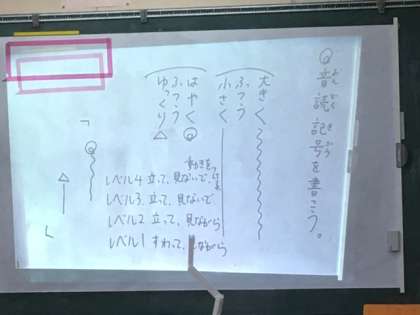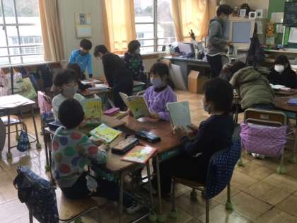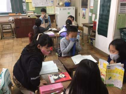 国語です。班のかたちになって音読の練習をしています。たがい違いになり距離をとっての活動です。