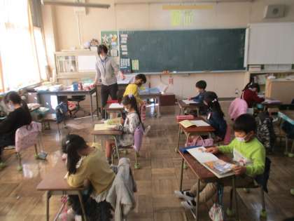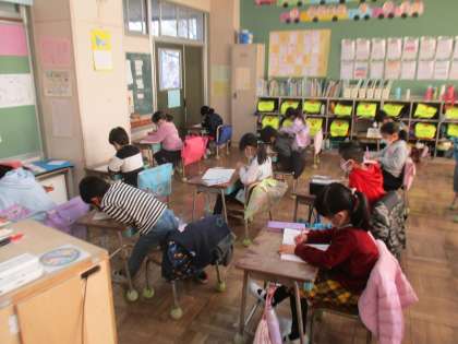 算数のテストが終わって、自由帳と読書の時間になりました。テスト頑張ったそうです。