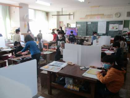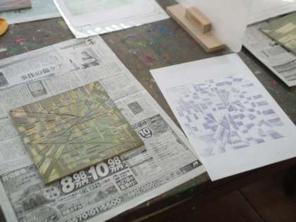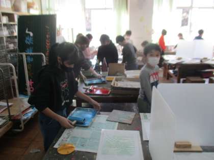図工です。版画に取り組んでいます。きれいな明るい色で刷り上げました。