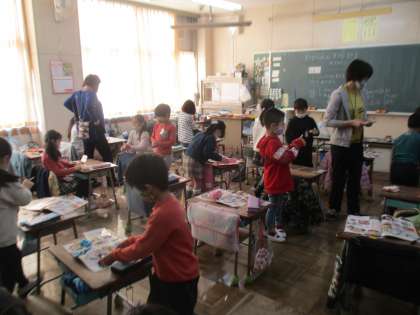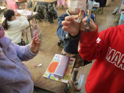 図工です。「すきまちゃんのすきなすきま」ということで、工作にとりかかりました。楽しそうです。