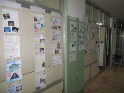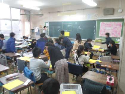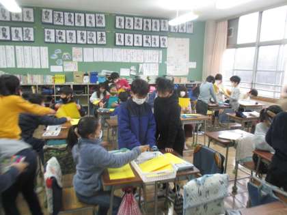 3年生と共同で6年生へのメッセージカードを作るそうです。今日は、体育が雨でできなかったので、その下準備の時間となりました。