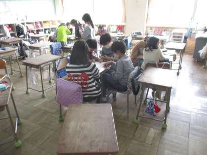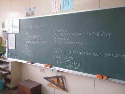 総合的な学習の時間です。「自分たちでできること」というテーマで、ポスターづくりをしているところです。