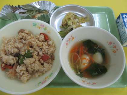 5月18日の給食 公開日 2021/05/19 更新日 2021/05/19 給食室より 18日のこんだては、 ・かてめし ・桑都焼き ・絹のお吸い物 ・梅おかかキャベツ ・牛乳 です。 今日は、八王子がむかし「桑の都」と呼ばれていたことにちなんだこんだて、「桑都御膳」です。郷土料理の「かてめし」、八王子産の桑の葉粉を使った「桑都焼き」、絹の粉「シルクパウダー」を練りこんだ白玉団子の入った「絹のお吸い物」。じっくり味わってください。 いいね(0)