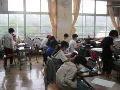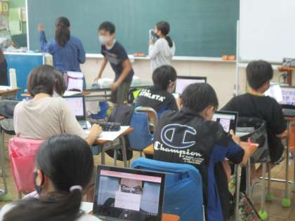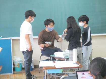 1年生と一緒に体育館で新体力テストをして、教室に戻ってきました。新体力テストの握力調査をしながら、タブレットに慣れる時間となっています。